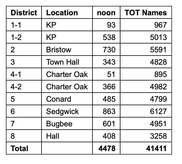 According to Rousseau, the turnout was trending virtually the same as for the 2023 municipal election, with roughly 3% overall turnout at 8 a.m., 7% turnout at 10 a.m., and 11% turnout by noon. The voter rolls – prior to adjustment due to same day registration and other updates – indicate 41,411 active voters in West Hartford.