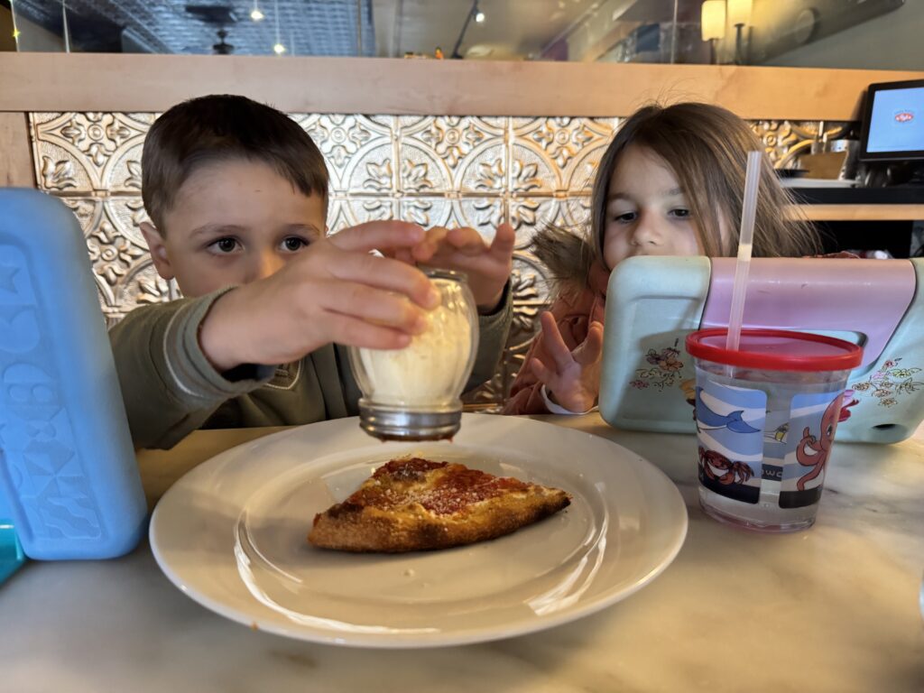 Autumn Elmazi’s kids enjoying Luna Pizza in West Hartford. Photo credit: Melissa Cole