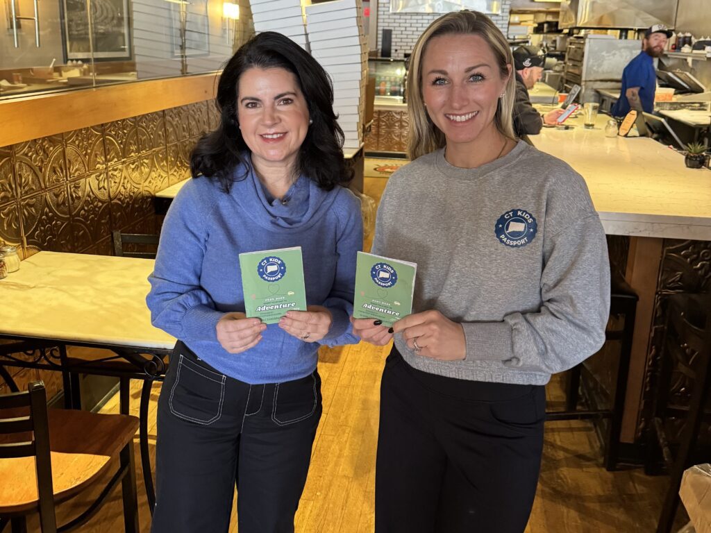 Melissa Cole (left) and Autumn Elmazi hold up the CT Kids Passports at Luna Pizza in West Hartford. Courtesy photo