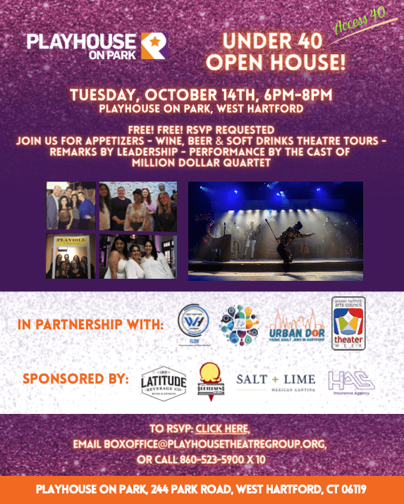 Join under-40 members of the Playhouse Theatre Group, Inc. Board of Directors and Advisory Council Members on Tuesday, Oct. 14, 2025, from 6-8 p.m. for refreshments, theatre tours, remarks from Playhouse on Park staff and volunteers, and a performance by some of the cast members from “Million Dollar Quartet.”
