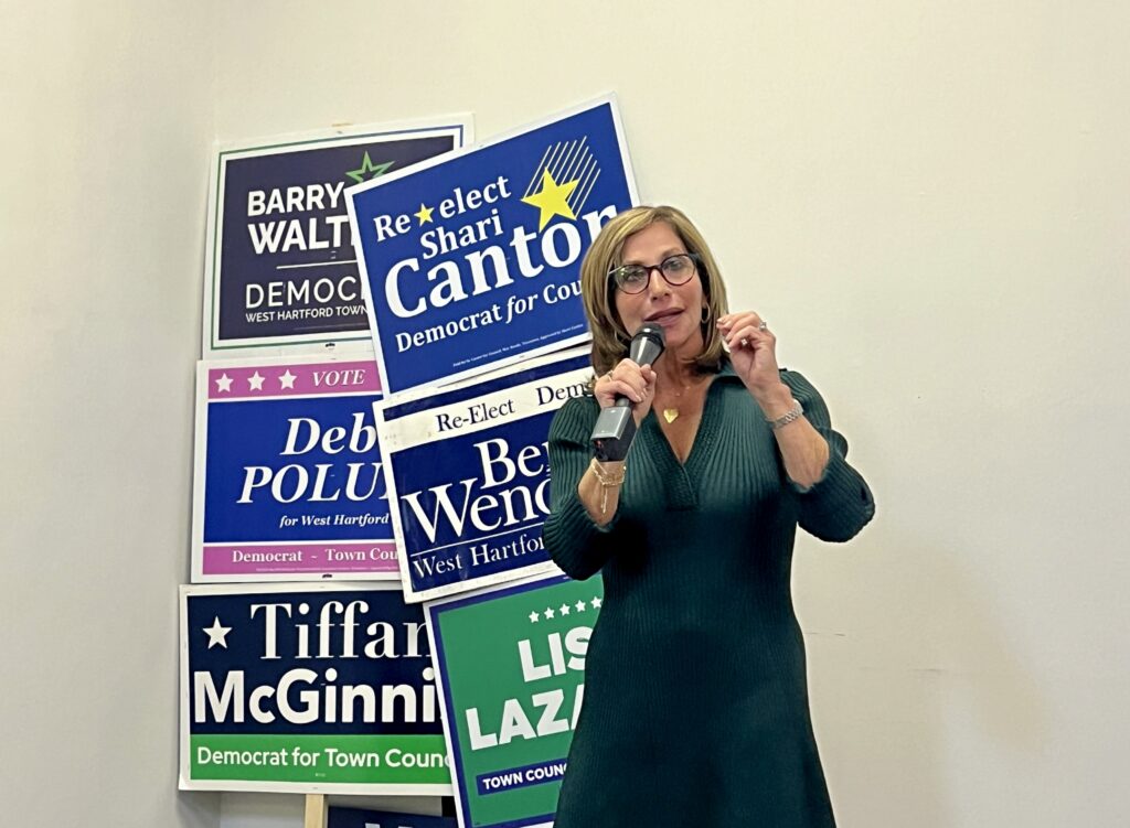West Hartford Mayor Shari Cantor speaks to supporters at Democratic headquarters on Tuesday night. Photo credit: Ronni Newton