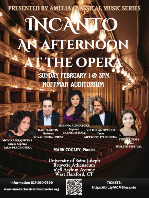 The Amelia Classical Music Series (ACMS) is proud to present “Incanto: An Afternoon at the Opera,” a thrilling operatic concert featuring five internationally acclaimed vocalists, on Sunday, Feb. 1, 2026. The performance will begin at 3 p.m. at Hoffman Auditorium at the Bruyette Athenaeum, University of Saint Joseph, in West Hartford.