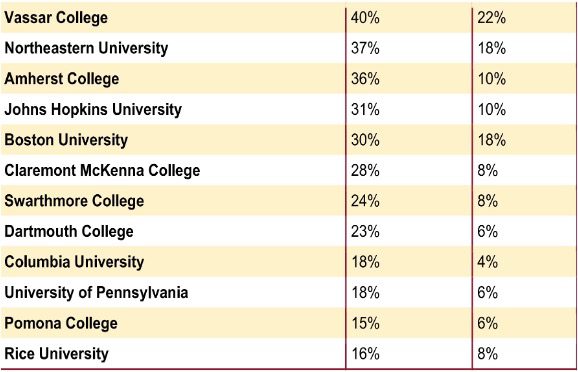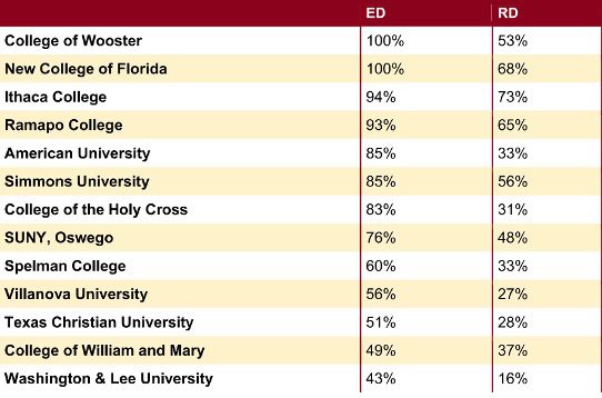 Many students, however, believe that applying early decision will give them an advantage. This may or may not be true. Below is a table prepared by Alpha Financial Partners that will give you a sense of the percentage of students who are admitted to various colleges under their early decision plan as opposed to their regular decision program.