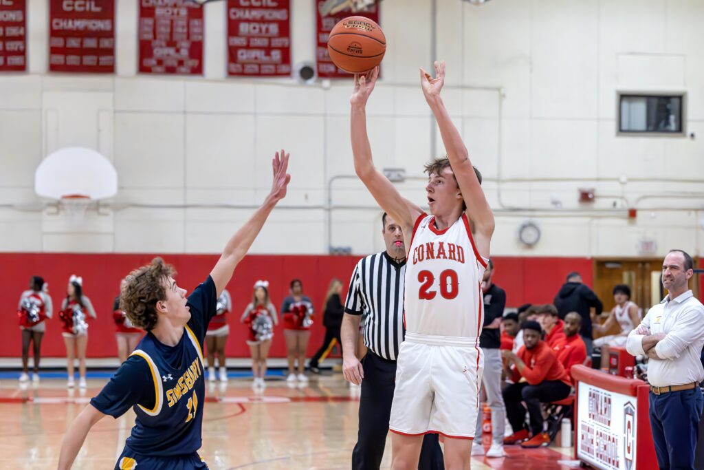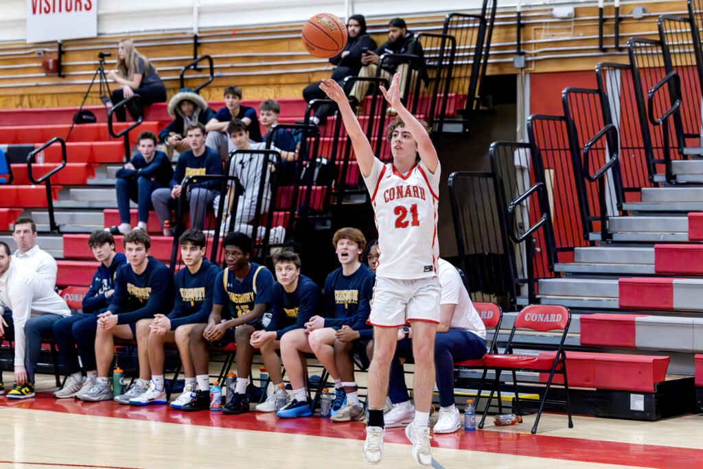 James O’Sullivan shoots a 3-pointer. Conard vs. Simsbury boys basketball. Jan. 27, 2026. Photo credit: Scott Sulkazi