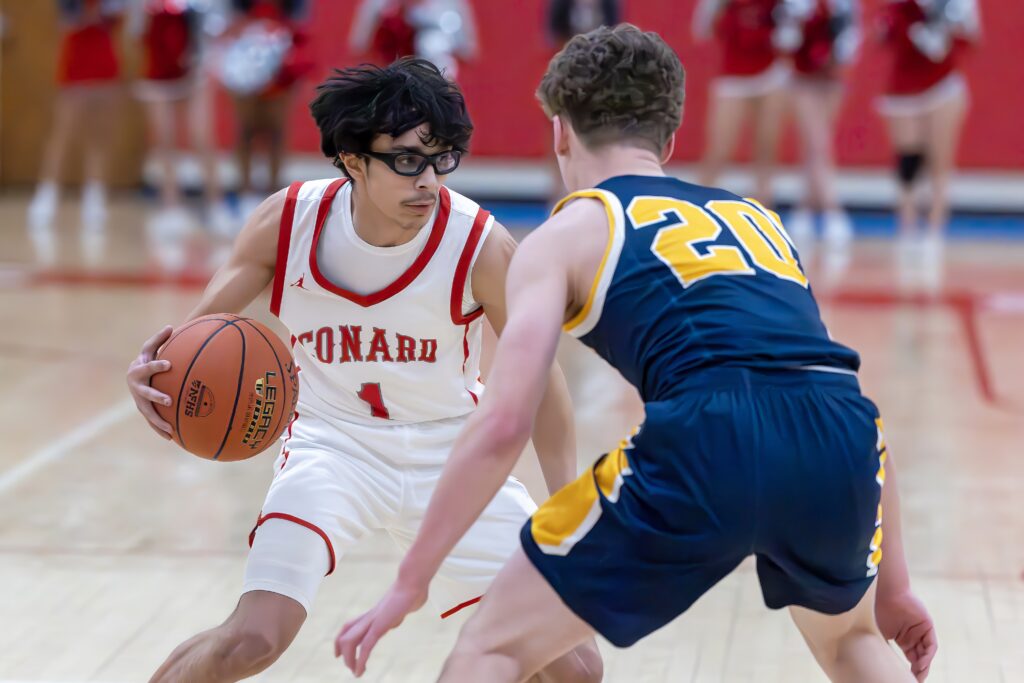 Dominic Burgos is looking for an opening. Conard vs. Simsbury boys basketball. Jan. 27, 2026. Photo credit: Scott Sulkazi