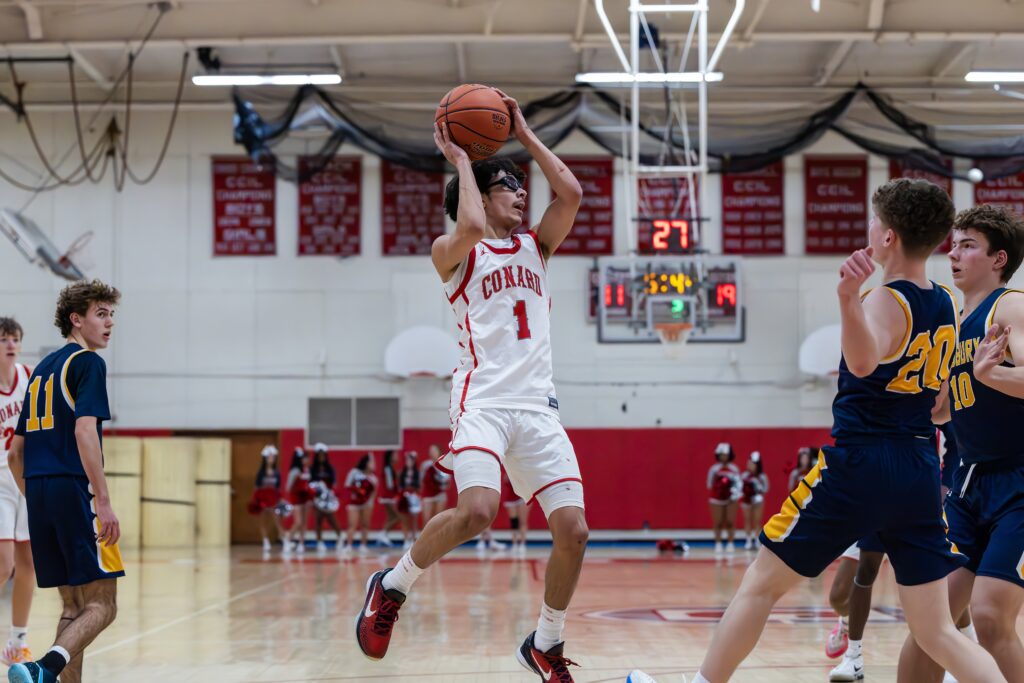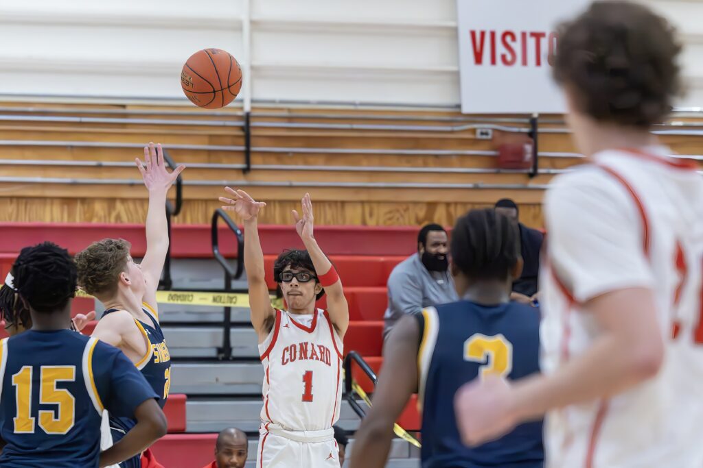 Dominic Burgos is attempting a 3-pointer. Conard vs. Simsbury boys basketball. Jan. 27, 2026. Photo credit: Scott Sulkazi