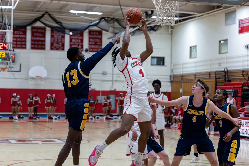 Shane Morris goes up for a shot. His layup in the final period brought Conard within a point, but Simsbury held onm for the win. Conard vs. Simsbury boys basketball. Jan. 27, 2026. Photo credit: Scott Sulkazi