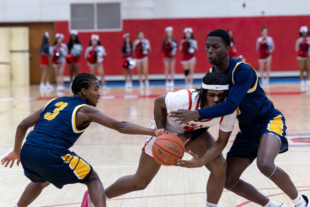 Dominic Burgos and Shane Morris are fighting for possession against Trojan players. Conard vs. Simsbury boys basketball. Jan. 27, 2026. Photo credit: Scott Sulkazi