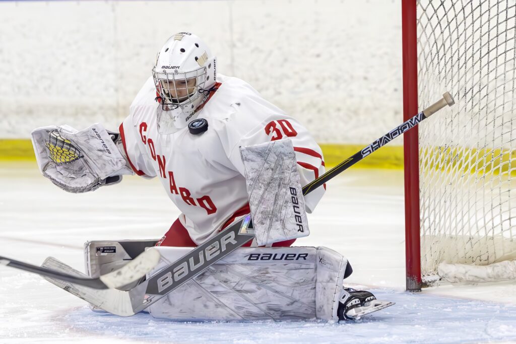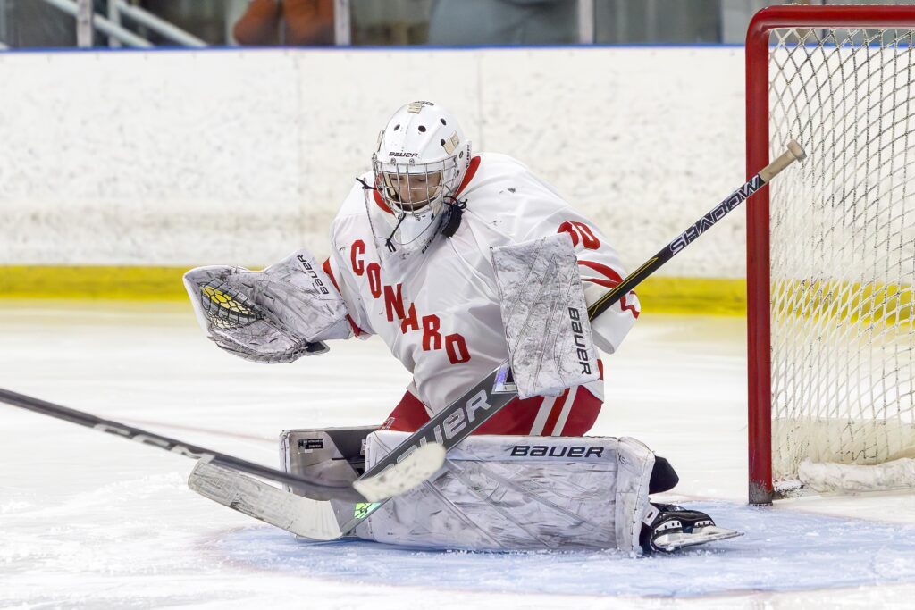Chase Emery is making a save. Conard vs. Rocky Hill boys hockey. CCC Championship. March 6, 2026. Photo credit: Scott Sulkazi