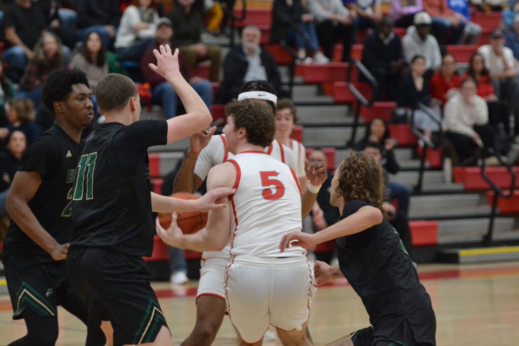 Aidan Fox finds himself boxed in by three Enfield defenders. Conard vs. Enfield boys basketball. Dec. 18, 2025. Photo credit: Paul Palmer