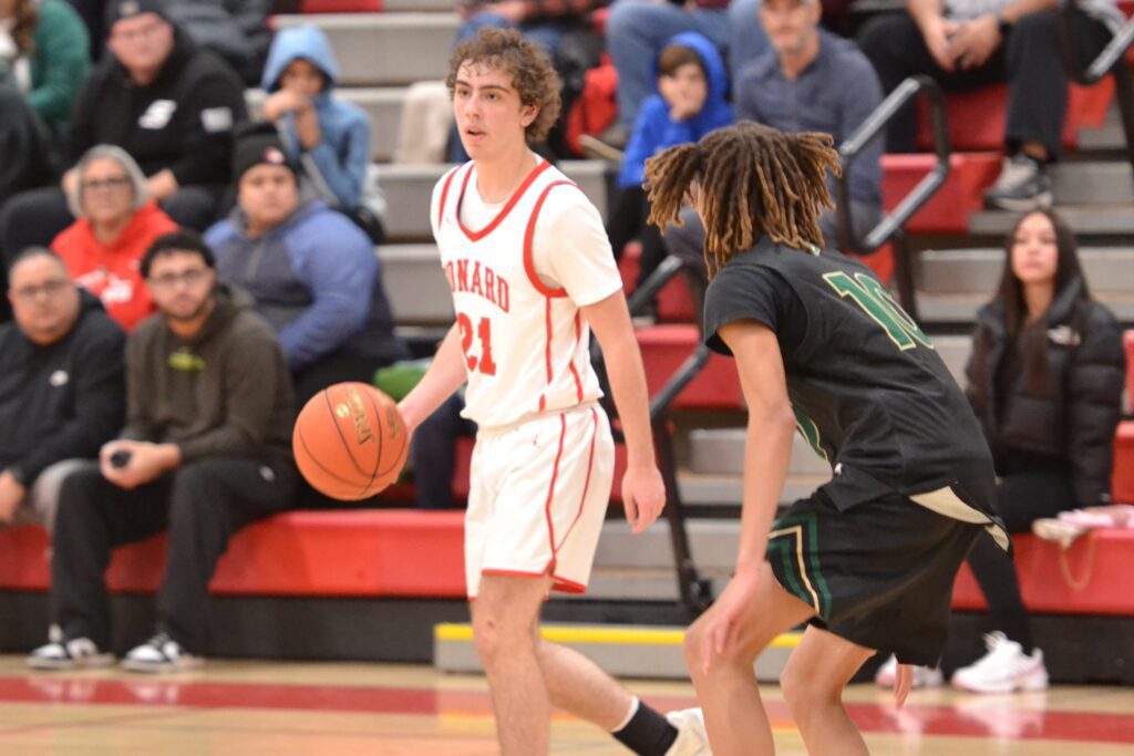 Ryan Barnum brings the ball upcourt for Conard. Conard vs. Enfield boys basketball. Dec. 18, 2025. Photo credit: Paul Palmer