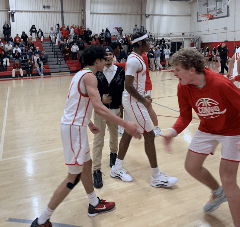 Conard players celebrate the season-opening win over Enfield. Conard vs. Enfield boys basketball. Dec. 18, 2025. Photo credit: Paul Palmer