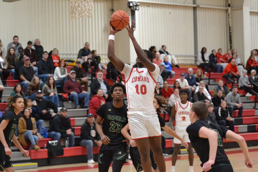 Just over two minutes into the second and trailing by two, Conard took a timeout to regroup as Enfield was doing the better job on the boards. Hughes kept up the hard work, grabbing back-to-back rebounds and putting the second one in before racing to the other end to block Enfield’s next shot. Despite the work of Hughes and Morris, it was Enfield building the 31-25 lead when Tallarita hit a corner 3 with :03 to go in the half.