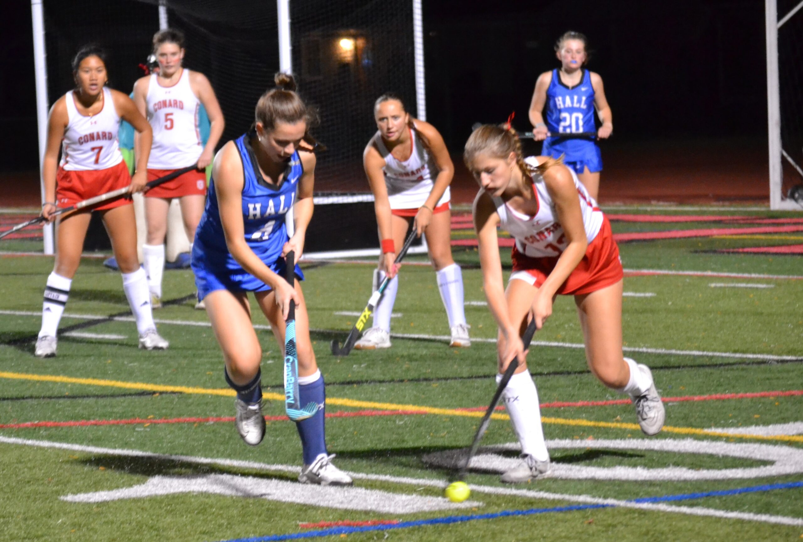 Livia Bush of Hall tries to stop a Conard player from moving the ball upfield