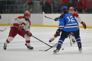 Henry Tammacio (18) looks to move the puck on Hall’s Zach Gerken