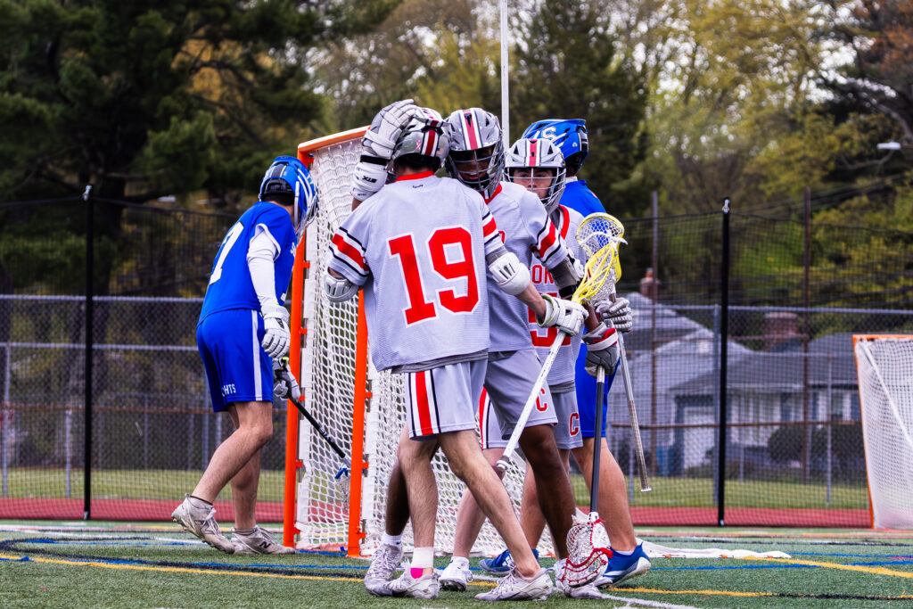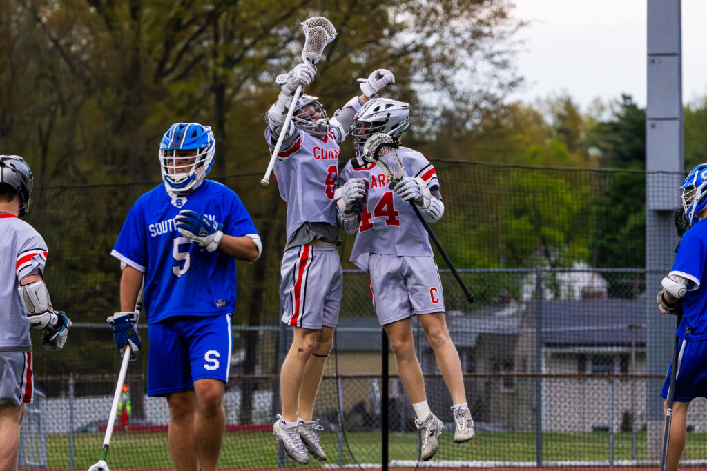 Conard celebrating a goal. Conard vs. Southington boys lacrosse. April 28, 2026. Photo credit: Savannah Cote