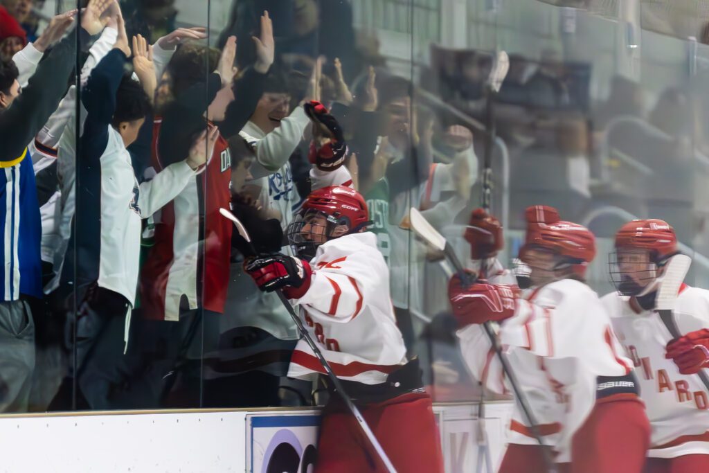 The Conard Red Wolves are celebrating a goal with their student section. Conard vs. Newington boys hockey. Jan. 7, 2026. Photo credit: Scott Sulkazi