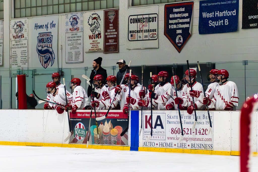 Conard’s bench was confused by a call. Conard vs. Newington boys hockey. Jan. 7, 2026. Photo credit: Scott Sulkazi