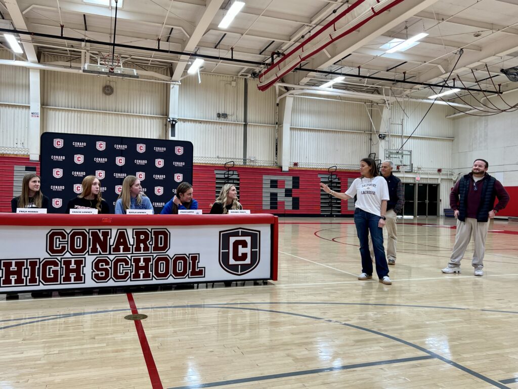 Girls lacrosse coach Meg Cersosimo speaks at College Commitment Day at Conard High School. Nov. 19, 2025. Photo credit: Ronni Newton