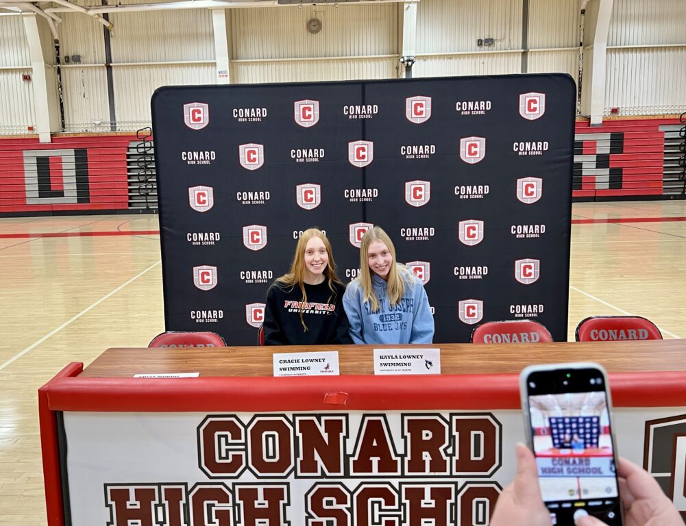 Twin sisters and swimmers Gracie (left) and Kayla Lowry pose for photos at College Commitment Day at Conard High School. Nov. 19, 2025. Photo credit: Ronni Newton