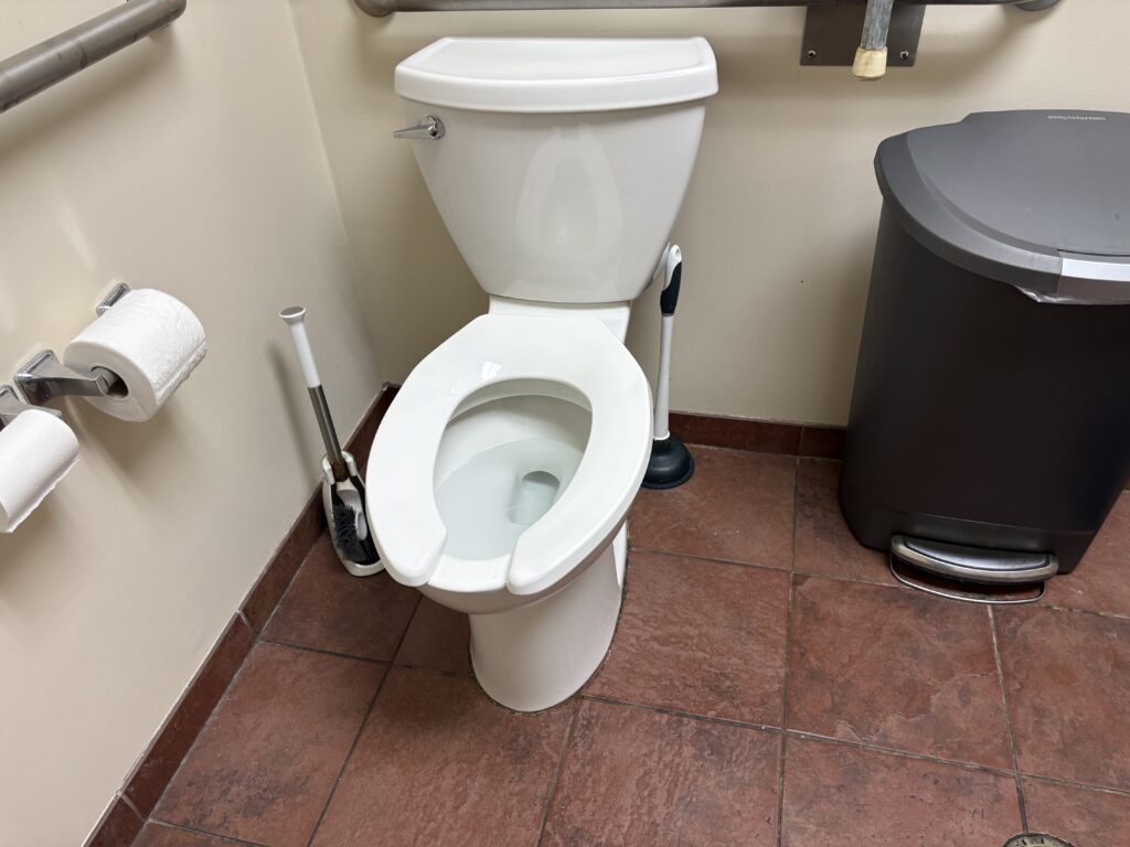 This toilet in a public site has no lid, which would protect users from harmful bacteria that accompanies the invisible “poo” plume in the current high-powered flushes. Photo credit: Harlan Levy
