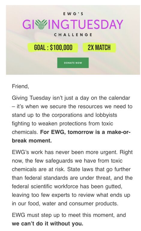 A typical email pitch for a charitable contribution for a Giving Tuesday event. Question: Is it legitimate? Courtesy of Harlan Levy