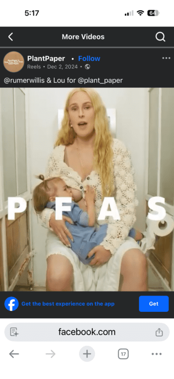 In the video spot Willis is sitting on a toilet, breastfeeding her toddler daughter, saying she’s here to talk about your toilet paper, “that fluffy white stuff you use to wipe your [butt] with? Well, it’s contributing to your risk of cancer. Recent studies found that most toilet paper brands contain PFAS, forever chemicals. They don’t break down, and they never leave your body.” She continues, “They’ve been linked to birth defects, fertility issues, and even cancer.” Most toilet paper manufacturers use bleach and formaldehyde to process tree pulp, she says, leading to hemorrhoids, UTIs, yeast infections, and vulvovaginitis.” The good news, she concludes, is that she’s been using PlantPaper for two years. “It’s 100% toxin-free, lab-tested, formaldehyde-free, bleach-free, and PFAS-free.”