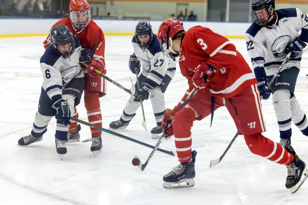 Fighting for possession on a face-off. Conard vs. Wethersfield. CIAC Division II boys hockey quarterfinals. March 13, 2026. Photo credit: Savannah Cote
