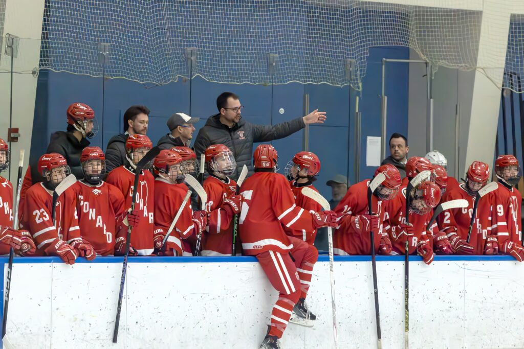 Conard strategizing before the game. Conard vs. Wethersfield. CIAC Division II boys hockey quarterfinals. March 13, 2026. Photo credit: Savannah Cote