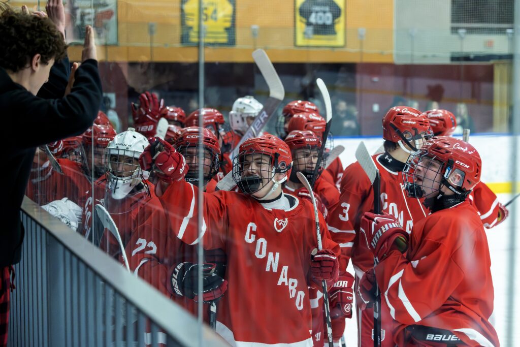 Conard players celebrate a goal. Conard vs. Wethersfield. CIAC Division II boys hockey quarterfinals. March 13, 2026. Photo credit: Savannah Cote