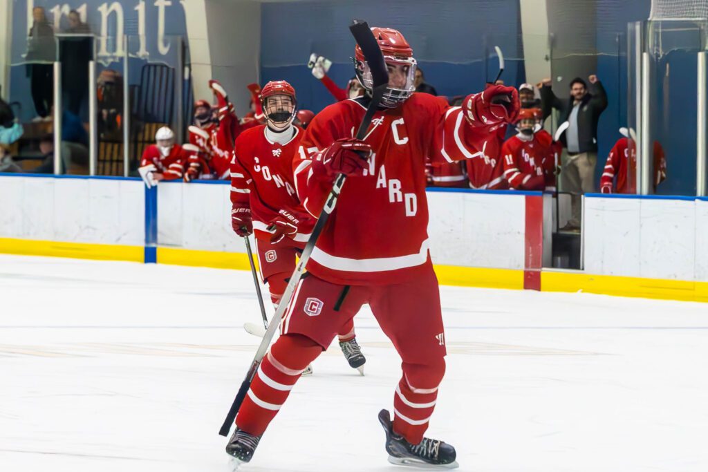 Torin McGoldrick celebrating a goal. Conard vs. Wethersfield. CIAC Division II boys hockey quarterfinals. March 13, 2026. Photo credit: Savannah Cote