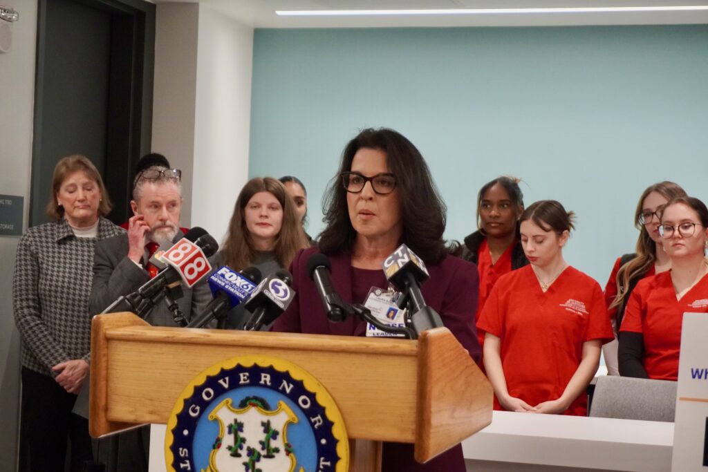 Laura Bailey, regional vice president of Patient Services for Hartford HealthCare speaks at a press conference regarding Connecticut’s participation in the nursing licensure compact at the University of Hartford, Dec. 11, 2025. Photo credit: Ronni Newton