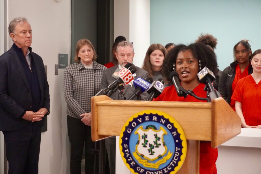 UHart senior nursing student Zaheerah Fuller speaks at a press conference regarding Connecticut’s participation in the nursing licensure compact at the University of Hartford, Dec. 11, 2025. Photo credit: Ronni Newton