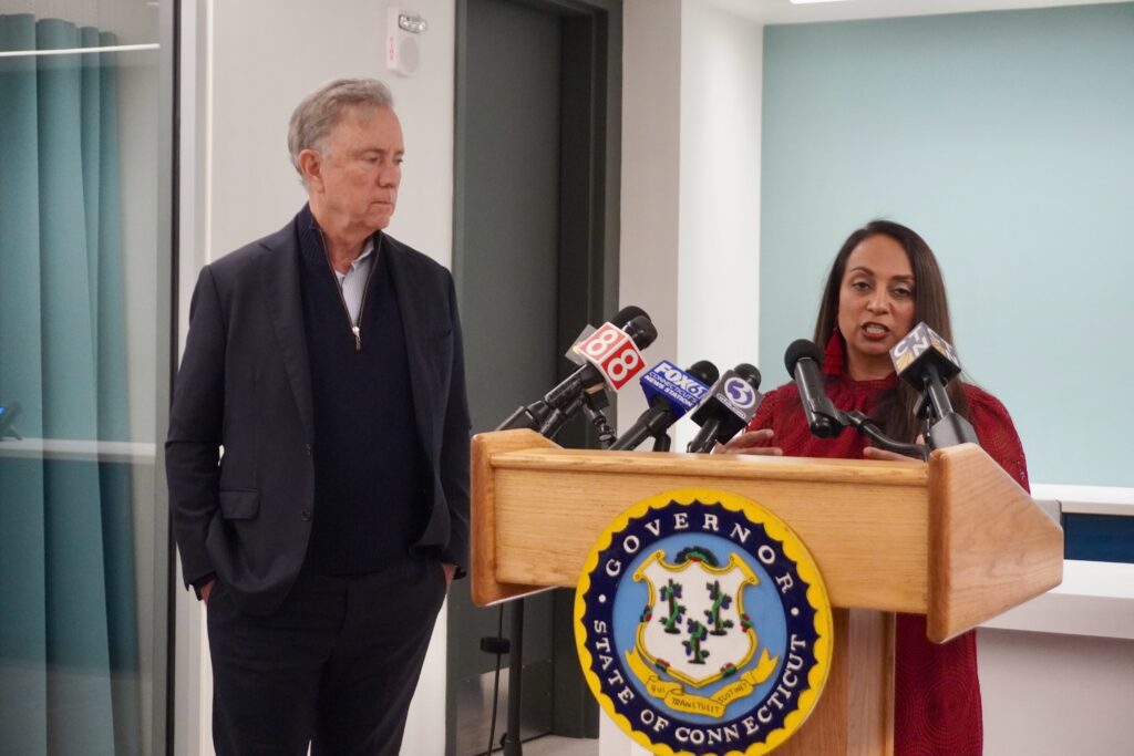 DPH Commissioner Manisha Juthani, MD, and Gov. Ned Lamont discuss Connecticut’s first measles case in more than four years at a press conference at the University of Hartford, Dec. 11, 2025. Photo credit: Ronni Newton