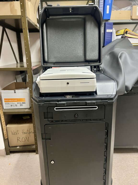 The DS950 can handle a large volume at once, and is capable of counting 200 ballots per minute. Ballots land in one of three trays – those that are uncounted for reasons such as unreadable marks, ballots with write-in candidates, and ballots that are counted. The are no certified write-in candidates in West Hartford for this election, the registrars said.
