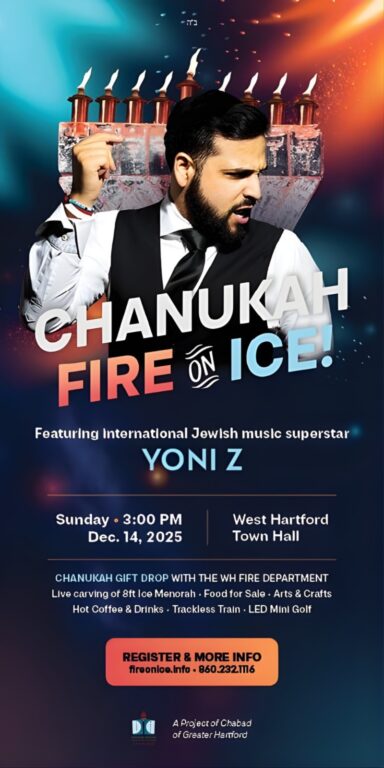 Chabad of Greater Hartford invites the entire community to this year’s Chanukah “Fire on Ice” Mega celebration on Sunday, Dec. 14, 2025, in West Hartford Center. The event begins at 3 p.m. and registration is free of charge.