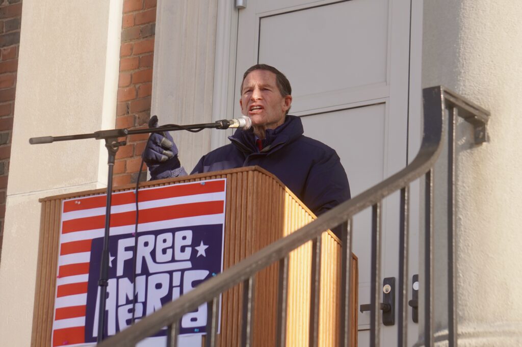 U.S. Sen. Richard Blumenthal speaks at the Free America Walkout in West Hartford. Jan. 20, 2026. Photo credit: Ronni Newton