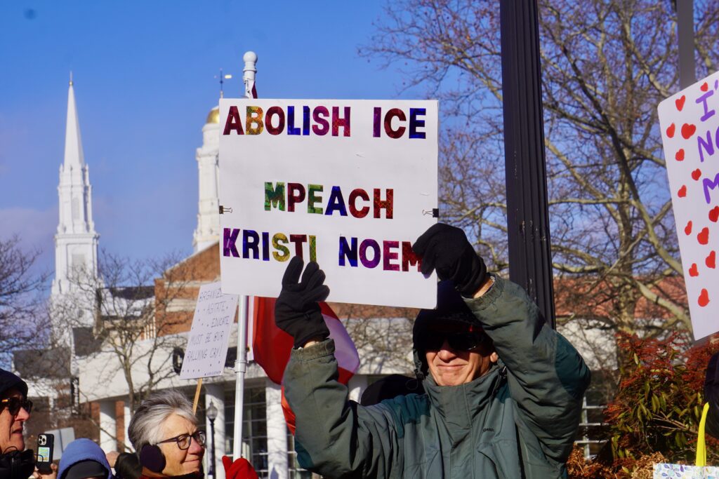 And echoing a portion of his message shared at West Hartford’s Martin Luther King Jr. Day ceremony the previous day, Blumenthal said, “We are here today to make trouble, good trouble, trouble for [Secretary of Homeland Security] Kristi Noem. Kristi Noem must go,” he said.