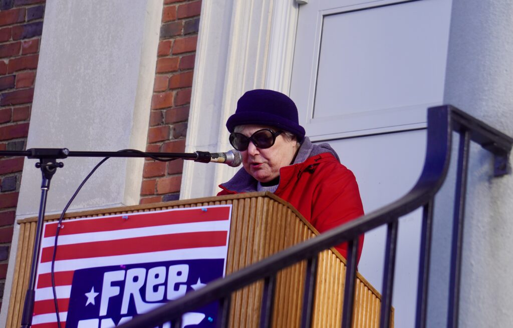 Former West Hartford Poet Laureate Ginny Connors reads a poem by Amanda Gorman at the Free America Walkout in West Hartford. Jan. 20, 2026. Photo credit: Ronni Newton
