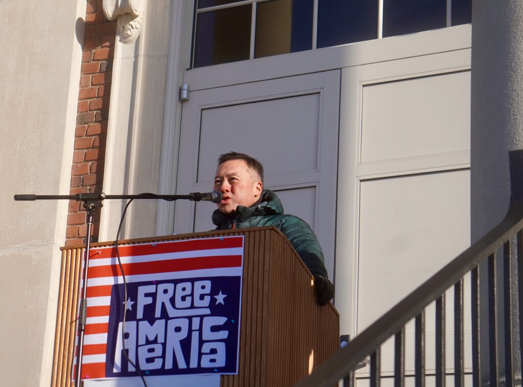 Attorney General WIlliam Tong speaks at the Free America Walkout in West Hartford. Jan. 20, 2026. Photo credit: Ronni Newton