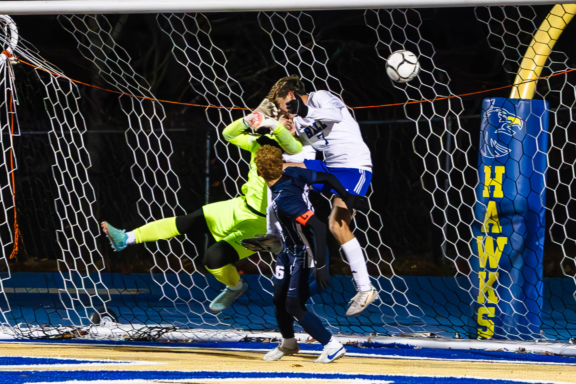 Northwest Catholic goalkeeper John Cashman makes a sliding stop before Conard’s Sam Musto can get a foot on the ball. Photo credit David Heuschkel