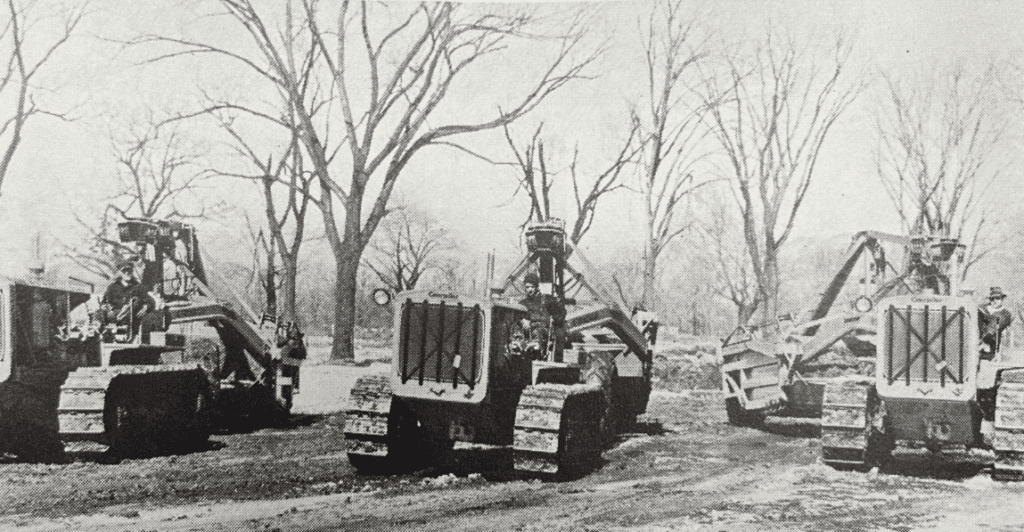 Work on the new factory started in March 1939 when tractors arrived to remove dirt for the foundations. The general contract for the construction went to the James Stewart Company of New York. Before the development of machinery like this, earthmoving was done entirely by human hands (and shovels, of course). The West Hartford reservoirs decades before were dug out (again and again) by gangs of men, mainly immigrants. Now, during the Great Depression, several of these big “cats” like the ones photographed were used at once on a tight schedule to meet production deadlines.