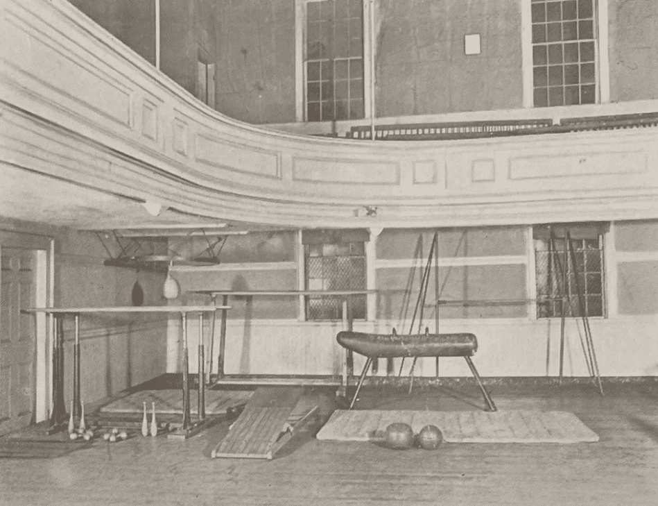 The photograph of the gym equipment, taken in the winter of 1913-1914, is very telling about what kind of strength mattered to the organization (and by extension, to young men). Modern weight training was not the emphasis; the gym had parallel bars, a pommel horse, Indian clubs, medicine balls, and climbing ropes. This is much more indicative of a turn-of-the-century gymnastic culture, in which strength was about balance and coordination, not hypertrophy training. This was about training to be efficient and rhythmic, not intimidating and arguably violent. Strength was something to be administered, not unleashed. And like all well-rounded people, they were encouraged to head across the street and feel comfortable in a home-like environment at the YMCA hall.