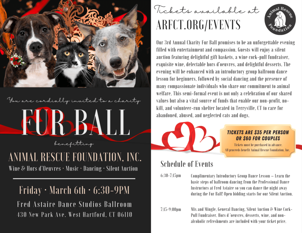 For more details and to purchase tickets, please visit www.arfct.org/events or contact Animal Rescue Foundation, Inc. at 860-583-3089 or [email protected].