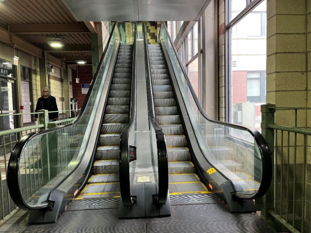 - Signage directs patrons to available stairs and escalators as alternate access routes.