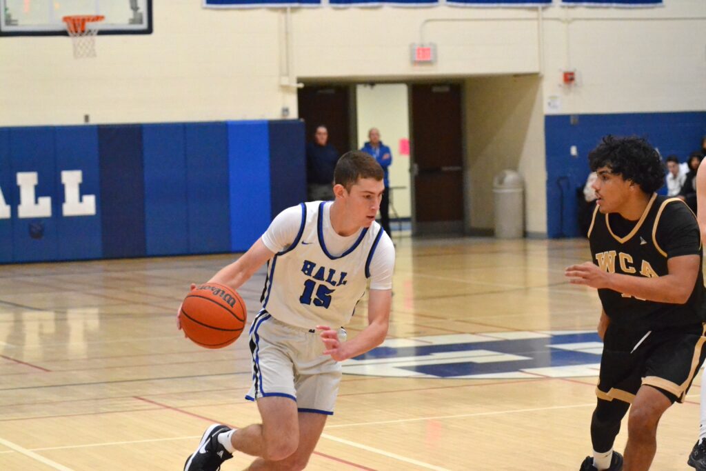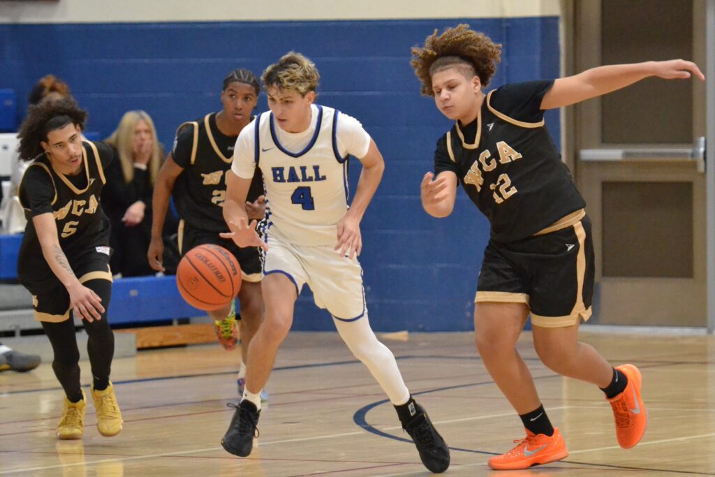 Tuesday it was WCA going out to an early six-point lead as Hall had trouble controlling the ball and hitting their shots. Dalin Fotache tied things up at 8 about five minutes in, and then teammate Lincoln Bush hit a pair of 3s to make it a 14-10 lead with 20 seconds to go. Before the buzzer would sound Nico Gilbert – who led Hall with 21 points – drained one of his five 3s in the game and the lead was 7 after one.