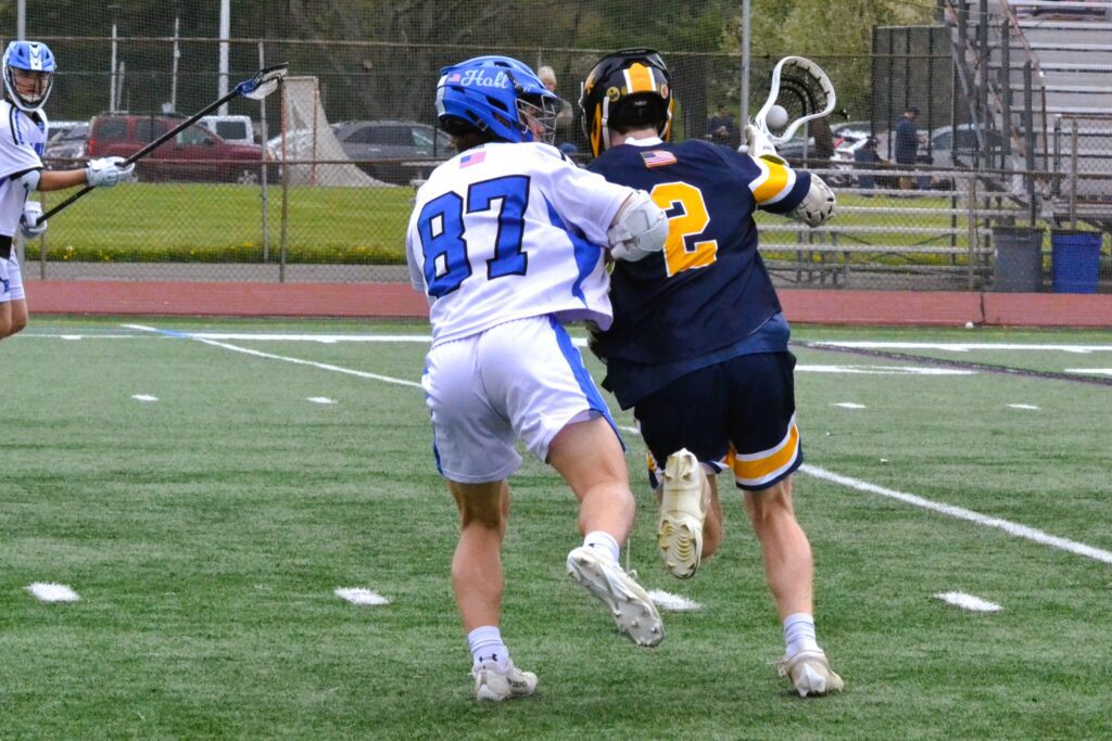 Ben Carlson (87) works to stay between Spencer Savoy (2) and the goal. Hall vs. Haddam-Killingworth boys lacrosse. April 25, 2026. Photo credit: Paul Palmer