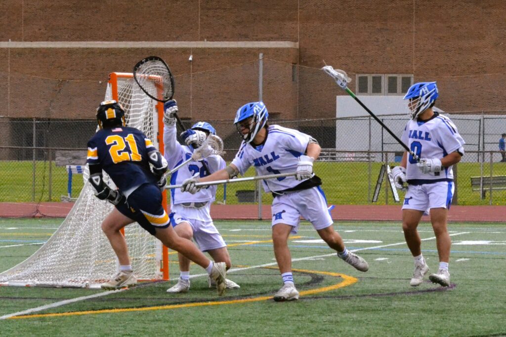 Ben Carlson scores one of Hall’s three goals. Hall vs. Haddam-Killingworth boys lacrosse. April 25, 2026. Photo credit: Paul Palmer