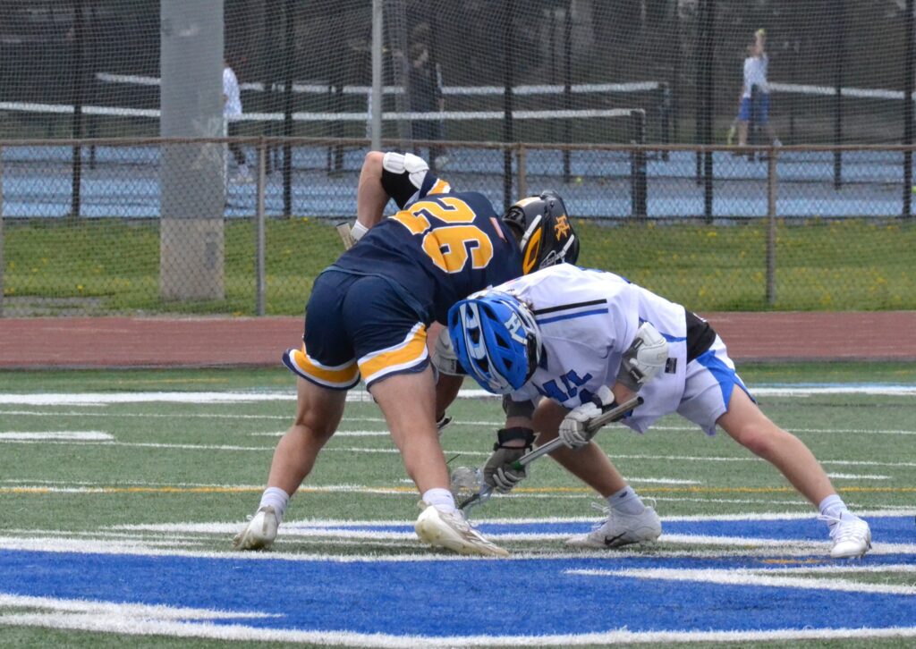 CJ Nunez of Hall battles for the loose ball. Hall vs. Haddam-Killingworth boys lacrosse. April 25, 2026. Photo credit: Paul Palmer