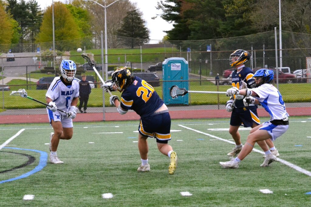 Bobby Biondi and HK defenders fight for the ball. Hall vs. Haddam-Killingworth boys lacrosse. April 25, 2026. Photo credit: Paul Palmer